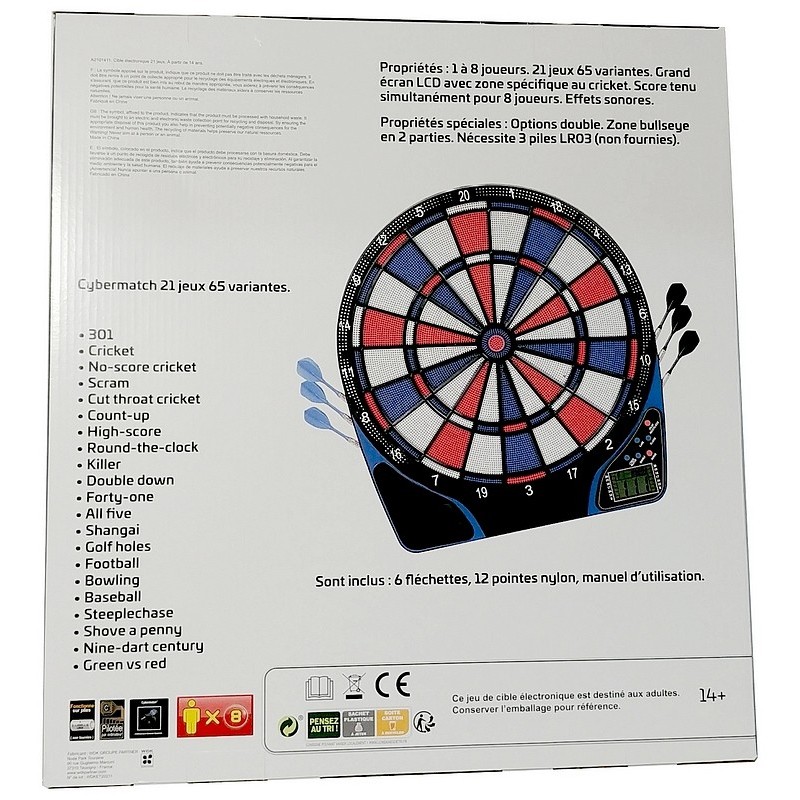 - Descriptif produit : CIBLE ÉLECTRONIQUE 8 JOUEURS – 21 JEUX : dont Cricket, Cybermatch. 65 variantes. Alim. 3 piles LR06 non incluses. Dès 6 ans.