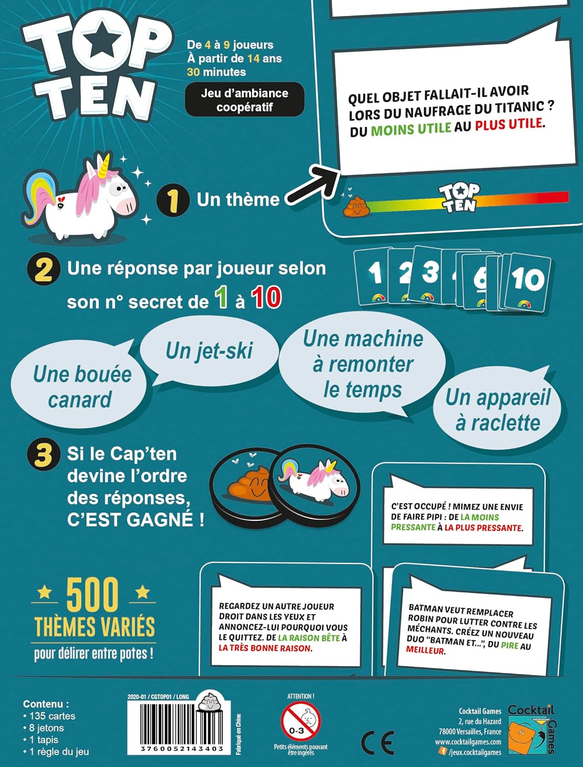 Jeu D’Ambiance Hilarant : Top Ten est un jeu de société qui promet des moments de rire et de divertissement entre amis ou en famille. Répondez tous à l’un des thèmes (drôles ou étonnants) en fonction de votre numéro (entre 1 et 10). Ensuite, l’un de vous,le Cap’Ten, tente de remettre toutes ces réponses dans le bon ordre pour faire gagner l’équipe ! Attention : avec Top Ten, il faut aussi donner les mauvaises réponses pour remporter la partie !
