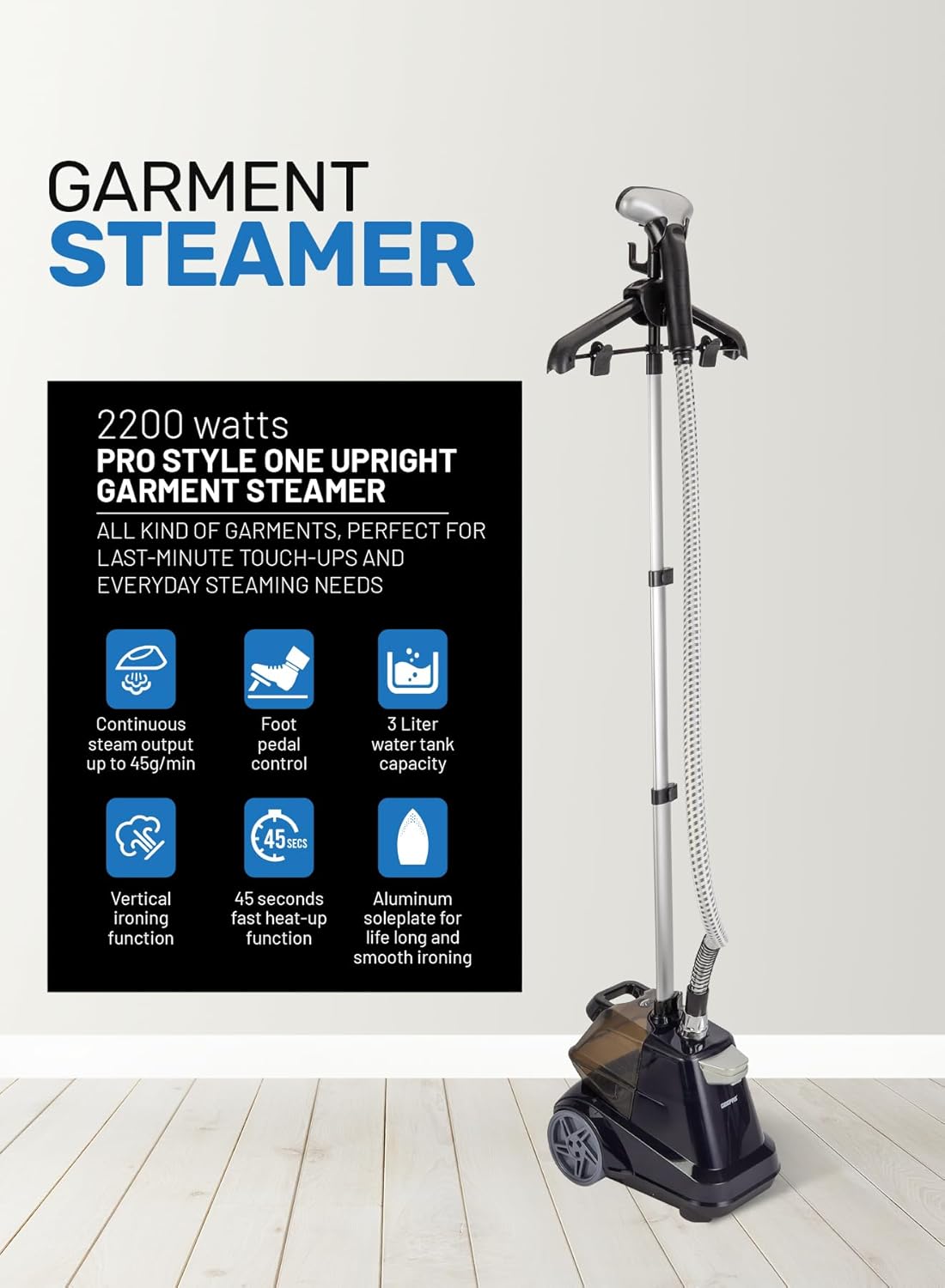 Profitez d’un défroissage professionnel à domicile. Avec le défroisseur vapeur Geepas, éliminez facilement les plis tenaces de vos vêtements et effectuez votre repassage. Doté d’une fonction de repassage vertical, ce défroisseur noir vous permet d’effectuer votre repassage efficacement et de réduire les risques de dommages. Simplifiez vos tâches quotidiennes et rafraîchissez vos vêtements et autres articles en toute sécurité et efficacité. Le défroisseur défroisse avec un débit de vapeur continu de 45 g/min. La pédale de commande à un niveau de puissance permet une utilisation mains libres pour plus de confort et de simplicité. Le défroisseur propose des modes de vapeur personnalisables pour s’adapter à vos types de tissus. Le défroisseur chauffe rapidement en seulement 45 secondes, minimisant ainsi le temps d’attente et vous permettant de commencer à défroisser presque instantanément. Ce défroisseur défroisse efficacement et fonctionne à une puissance constante de 2200 watts. D’une capacité de 3 litres, ce défroisseur vapeur est idéal pour les retouches rapides sur vêtements ou tissus, mais peut également être utilisé pour défroisser la literie, les tissus d’ameublement et les rideaux. De couleur noire, il pèse 6,95 kg et bénéficie d’une garantie fabricant de 2 ans.