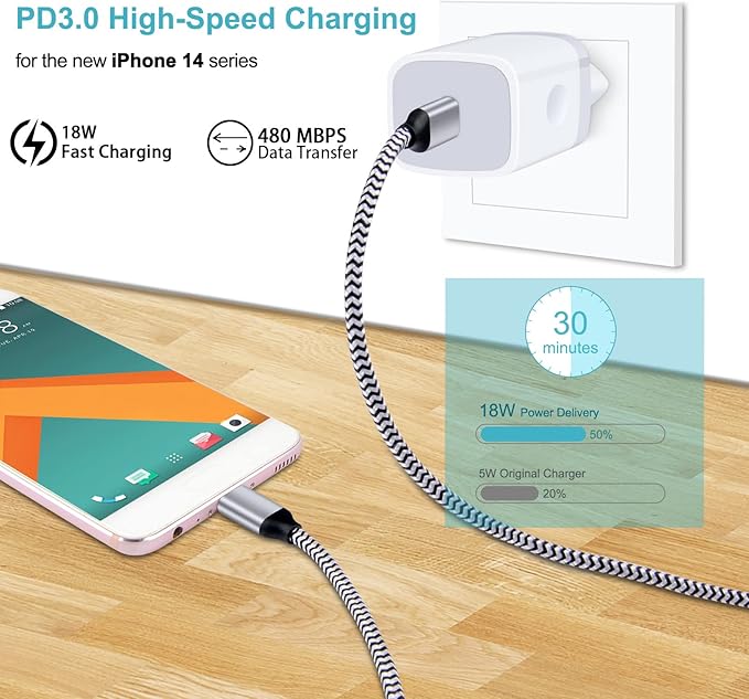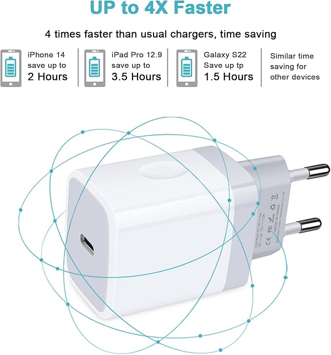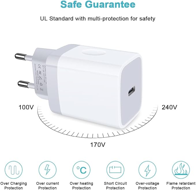Charge rapide. L’adaptateur USB-C PD 3.0 offre une charge rapide et efficace, jusqu’à 4 fois plus rapide qu’un chargeur 5 W. Il recharge votre iPhone 17/Air/17 Pro/17 Pro Max de 0 % à 75 % en seulement 30 minutes avec le câble d’origine (non inclus). Cet adaptateur secteur USB-C est doté de multiples protections contre la surchauffe, les surintensités, la surcharge et les courts-circuits.