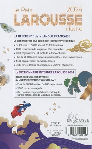 Plus de 63 800 mots, 125 000 sens et 20 000 locutions et 28 000 noms propres. •1 500 remarques de langue ou d’orthographe ; 2 000 régionalismes et mots de la francophonie ; 4 500 compléments encyclopédiques ; 5 650 cartes, dessins, photographies, schémas et planches. •Avec une carte d’activation pour bénéficier d’un accès privilégié au Dictionnaire Internet Larousse 2024 contenant plus de 80 000 mots, 9 600 verbes conjugués et des dossiers encyclopédiques.