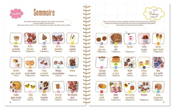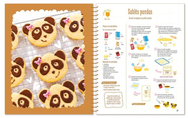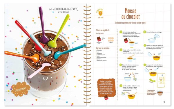 Mousse au chocolat, muffins, cookies, brownie, charlotte, crumble, riz au lait, mug cake, bâtonnets glacés… Sans oublier un superbe gâteau d’anniversaire ! Les apprentis pâtissiers vont trouver dans ce livre 30 délicieuses recettes testées et choisies pour leur simplicité et leur saveur. Préparer les ingrédients, regrouper les ustensiles, tout est indiqué pour aider les enfants à s’organiser avant de commencer. Les étapes sont clairement détaillées et illustrées pas à pas; celles qui demandent l’aide d’un adulte sont identifiées. Une photographie montre la recette terminée. Les pages sont plastifiées pour pouvoir être nettoyées et chevalet en carton épais permet de faire tenir le livre sur le plan de travail.