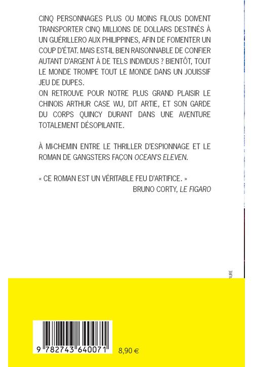 Cinq personnages plus ou moins filous doivent transporter cinq millions de dollars destinés à un guerillero aux Philippines afin de fomenter un coup d’Etat. Mais est-il bien raisonnable de confier autant d’argent à des individus aussi peu recommandables? L’idée est de diviser la somme en cinq, mais bientôt une autre idée émerge : chacun va vouloir garder le fric pour soi et tout le monde trompe tout le monde dans un jouissif jeu de dupes. On retrouve pour notre plus grand plaisir les personnages de Voodoo Limited : le Chinois Arthur Case Wu, dit Artie et son garde du corps Quincy Durant dans une aventure totalement débridée à l’efficacité narrative totale. « Ce roman est un véritable feu d’artifice ; ça part dans tous les sens ; ça explose toujours là où l’on s’y attend le moins : le suspense est béton jusqu’au bout ; le style percutant et lapidaire ; l’humour subtil et la dérision, omniprésents ; les personnages, magnifiques. » (Bruno Corty, Le Figaro Littéraire).